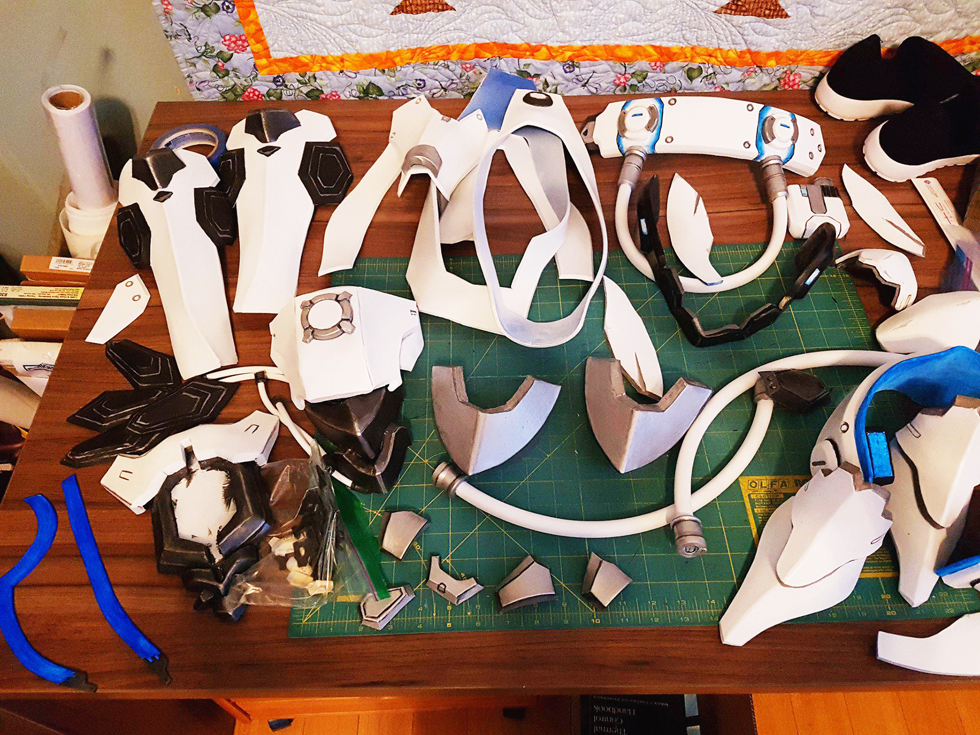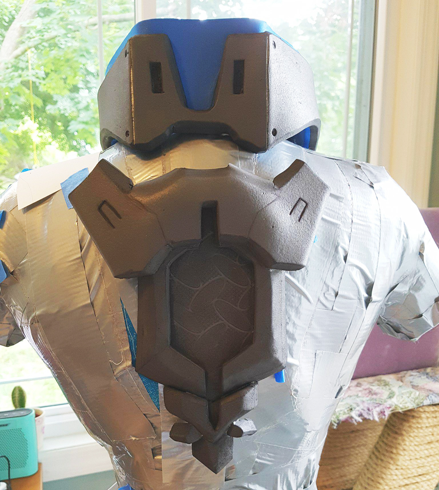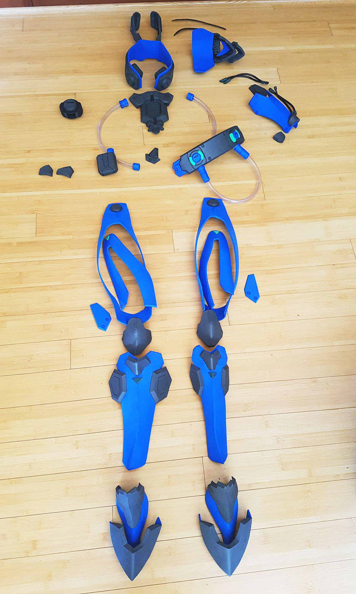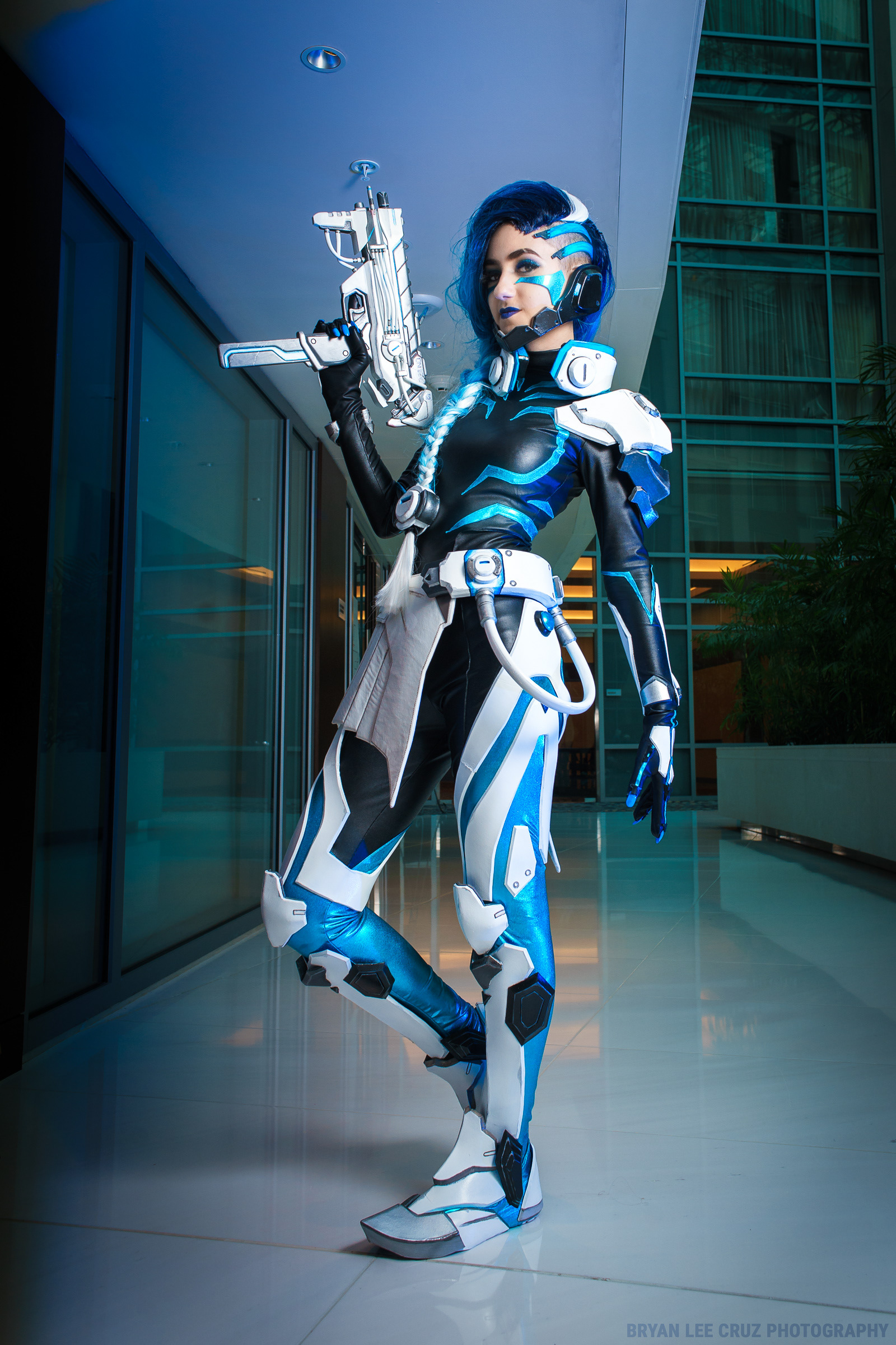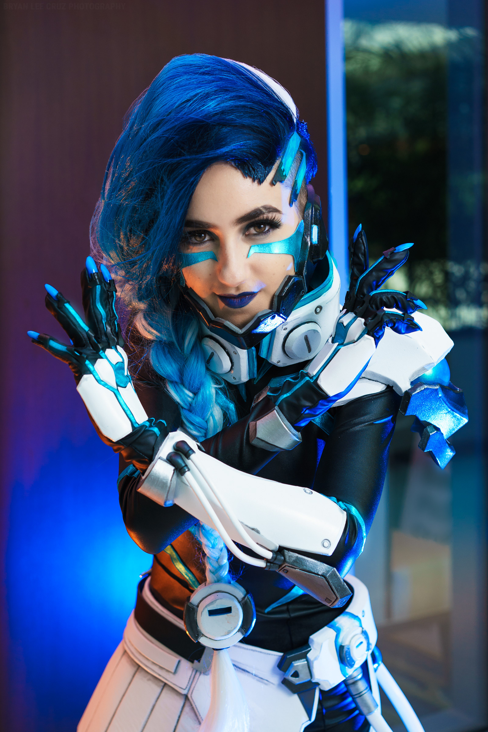 This costume of the character Sombra from Overwatch was created out of high density foam sheets and plastic tubing. The gun was 3D printed from a model made by Obsydiann Props, the bodysuit was made by Tanaya Shadmehr, and photography is by Bryan Lee Cruz. Character © Blizzard Entertainment